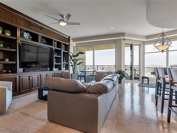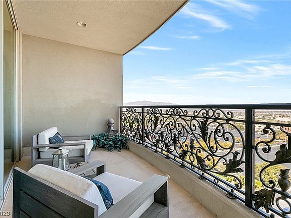 Luxury at its finest! Presenting this stunning two bedroom, three bath unit on the 10th floor at the highly desired Queensridge Towers. This unit provides its owner with 180° sweeping views of the Las Vegas Strip and is beautifully adorned with Granite Countertops, polished travertine flooring, dark espresso stained woodwork, and Viking appliances. The property is completed by a Sonos entertainment system with built-in speakers, an Alexa compatible smart faucet, remote controlled black out curtains in the bedrooms and living areas, a 2 car garage, and separate access to the unit for domestic staff. The building itself boasts countless amenities, including but not limited to: an on-site chef, expansive dining room and commercial kitchen, breakfast bar with barista, fitness center w/ Pilates/ Yoga studio, multiple pools/ spas, appointment based massage rooms, wine storage/ tasting room, dog park, valet service, on-site Casita rentals for guests, etc.