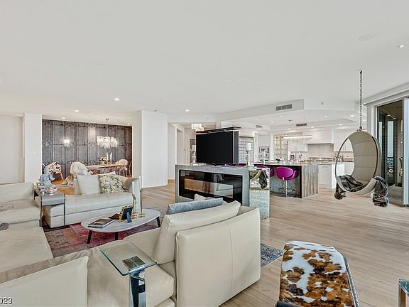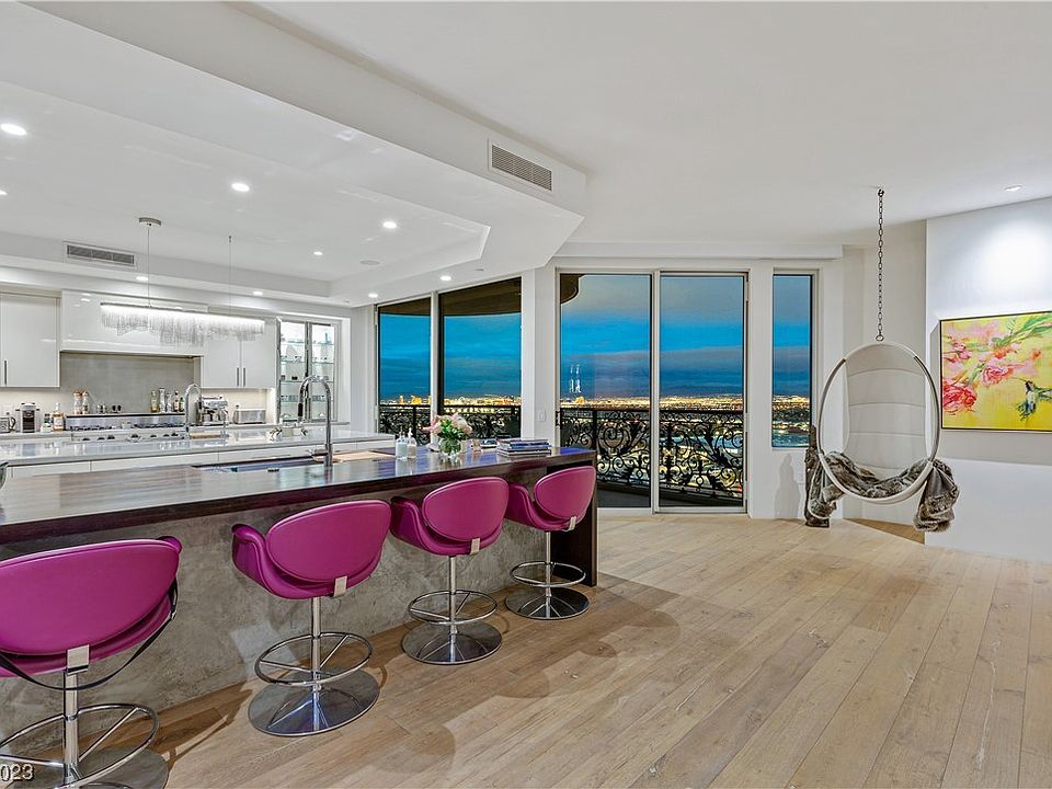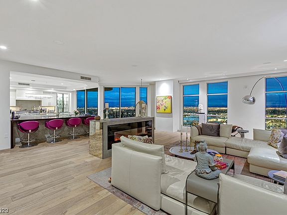 Exquisitely Designed Penthouse, This is the Best of the Best, Over 2 years & $2 M spent in this 5,100+ Sq. ft Masterpiece. Showcasing a Contemporary Design with floor to ceiling windows showcase full unobstructed Strip, Downtown, City, Sunrise Mountain and Red Rock Mountain Views. Features in this bright and open layout, an express private elevator right into the private foyer, huge great room, 4 en-suites, A+powder room, stunning dinning room with wine chillers, 3 terraces and an enclosed 4 car garage. The oversized Primary Suite is complete with a sitting room, private terrace, retail boutique custom closet and a customized bathroom with stream shower, vanity, tub, and two water closets with toto toilets. Custom Chef kitchen with concrete and stone counters, the best of the best appliances, double islands and it all effortlessly flows into the family room. Amenities emulate 5 Star Hotels with Valet, Concierge, complementary café, resort style spa/gym, security and more.