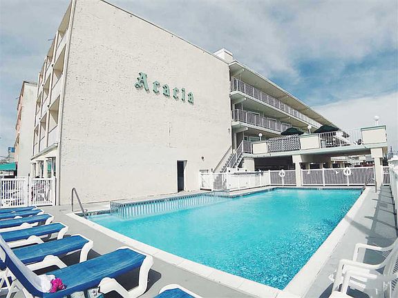 Cozy beach retreat with a sublime location in downtown Wildwood Crest! The Acacia Beachfront Resort is just steps from Wildwood Crest's free beaches and within walking distance to a plethora of exquisite shopping, dining, and entertainment options. This 1 bedroom, 1 bathroom unit incorporates an open floor plan. A private sitting area for the unit is located just outside of the main unit entry, and the well-maintained communal pool area with chaise lounge chairs is located directly by the beach. Parking is located directly underneath the building for 1 vehicle. This unit is currently utilized as a Vacation Rental and has an exemplary Vacation Rental history. (Documentation of rental history available upon request.) Luxury waterproof vinyl plank flooring installed in October 2019. There is a quarterly condo fee of $940 for exterior maintenance, liability insurance, flood insurance, water, sewer, common area elements, and the management company fee. The property is pet friendly for owners outside of rental season. Property open April 1st through October 31st and the rental season is Mid-May until Mid-September. Property does not schedule showings while rental tenants are occupying unit. During the Summer Season, showings will be accommodated by the lobby staff on turnover days between 12:00pm - 2:00pm only.