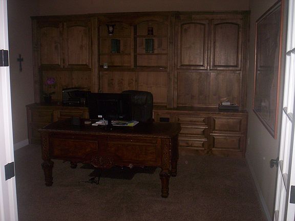 Golf course views without HOA fees! Spacious open floorplan with long views across the greens. The kitchen boasts beautiful granite, pantry and black appliances. The great room has a built-in entertainment center. The elegant office has refined built-ins, appropriate for study, game room or possibly a 4th bedroom. The generous master bedroom leads to the jetted tub to relax in or a large walk in shower. There are more extras, i.e.: 5'' baseboards, 10'-12' ceilings, alarm system, stamped concrete, plantation shutters, central vac, finished garage, wood floors and tile in the wet areas.