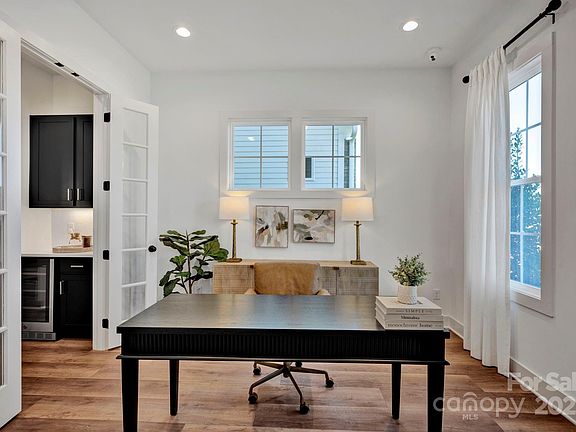 NEW CONSTRUCTION in East Charlotte - This gorgeous model home has the upgraded Modern Luxe design package with additional specialty lighting, wallpaper & 4 room surround sound speaker system. The open design features 10' ceilings & 8' doors/cased openings on the first floor, study in lieu of dining room with glass panel French doors, iron picket railing at staircase, a beautiful kitchen w/quartz counter tops, stacked cabinets with ceramic tile backsplash to ceiling behind decorative vented range hood, base cabinet microwave, beverage frig in butler pantry area, stainless steel refrigerator, oversized center island & under cabinet lighting. Huge walk-in pantry w/ventilated shelving provides generous storage. Electric fireplace w/mantle & floating shelves in family room. Luxury vinyl plank flooring on main level, upper hallway, & bedroom #2, Drop Zone w/lower seat, upper shelf, brackets & hooks. Primary bedroom on upper level with LVP flooring, full bath, double vanity, oversized tiled shower with frameless glass shower enclosure & walk-in closet. Cabinets in laundry room above washer/dryer location. 9' ceilings on upper level w/2 guest bedrooms (both with walk-in closets). Hall bath has tub/shower combo & ceramic tile walls & flooring. Covered rear porch designed for relaxed evenings. 2-car detached finished garage with drywall, trim and paint - rear loading with alley access. Ring doorbell & camera w/Yale door lock. Front lawn maintenance & irrigation covered by HOA.