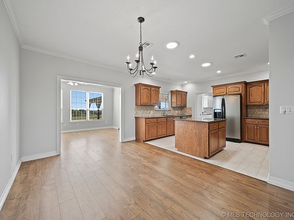 The home has; newer flooring, a newer roof, and many many upgrades, including USB chargers in each room. The kitchen has a great island and plenty of counter and storage space, plus a Whirlpool Gold oven. There is a second living that could be used for an office space, dining or flex room. The master suite could easily accommodate any of your furniture selections and has two separate walk-in closets and a bubble massage tub. Plus the peace of mind of the in-ground storm shelter located within the three-car garage.