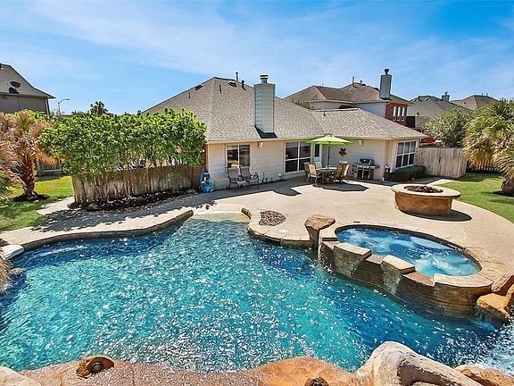Vacation at home in this fabulous backyard! Gunite pool offers boulder rock slide, caves, waterfalls, grotto, swim up bar with palapa outdoor kitchen. Pool bath, gas fire pit. Water softener. Double wide entry gate to backyard. Home offers tile & wood floors, fully furnished study with built ins and plasma tv. Kitchen with island & newer stainless appliances. Cozy breakfast nook. Open concept to family room with fireplace, plasma TV and all audio equipment included. Surround sound/speakers. Fully remodeled master bath w/onyx countertops & underlighting, oversized jetted tub, and glass tile shower. Walk in closet.HWH-2015, Additional drains installed in front & back yard - 3/2016. New gutters installed and rerouted 2016, Recolor and reseal pool - 2017,Upgrade pool heater - 1/2017. Replace tiki hut roof - 1/2017, Upgrade A/V to HDMI, new receiver and TV - 3/2017,Upgrade A/C to 4 ton 18 SEER Trane unit/thermostat with ducting in attic for optimal cooling - 6/2017. MOVE IN READY!