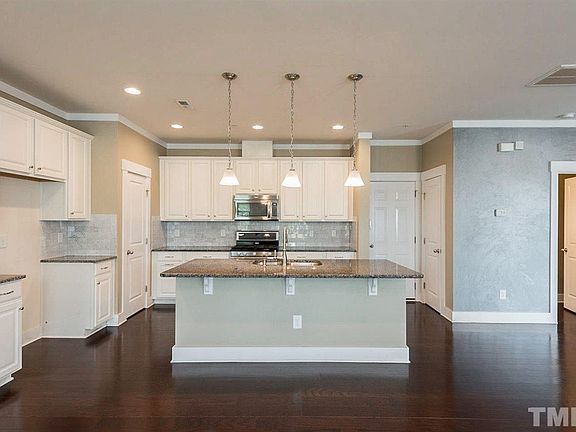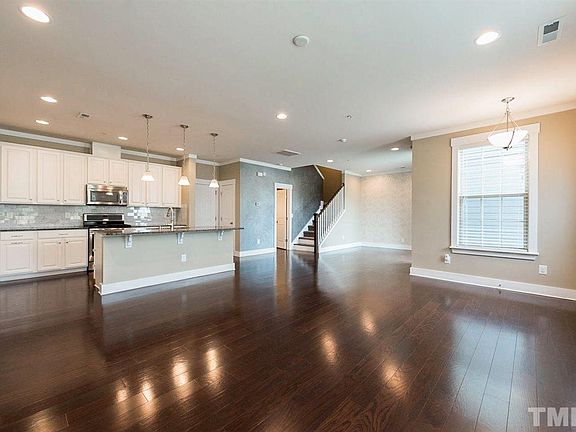Built-in 2013, this Raleigh townhouse offers hardwood flooring, a fireplace, stainless steel appliances, a kitchen island breakfast bar, a walk-in closet in the master suite, a third-floor bonus space, and a two-car garage.