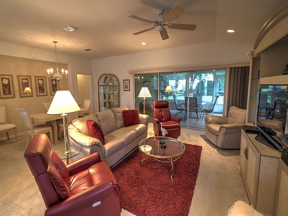 Great location near Horizon Center, Pro Shop and Family Pool. Great curb appeal. Concrete block and stucco. Professionally landscaped. Eat-in kitchen with double pantry, breakfast bar and bay window. Island shutters throughout the house. Soft designer colors. Dining/living room combo. Inside laundry room (newer washer). Enclosed lanai with carpeting, vertical blinds and additional electric outlets. Newer awning on south lanai windows. Sliding privacy screens (Jan. 2020) on 2-car garage; insulated garage door, storage cabinetry to stay with house. HVAC system with humidity control and Aprilaire filter (July) and water heater (Febr.) installed 2020. Survey available. Some furniture will be available as well as golf cart under separate package.