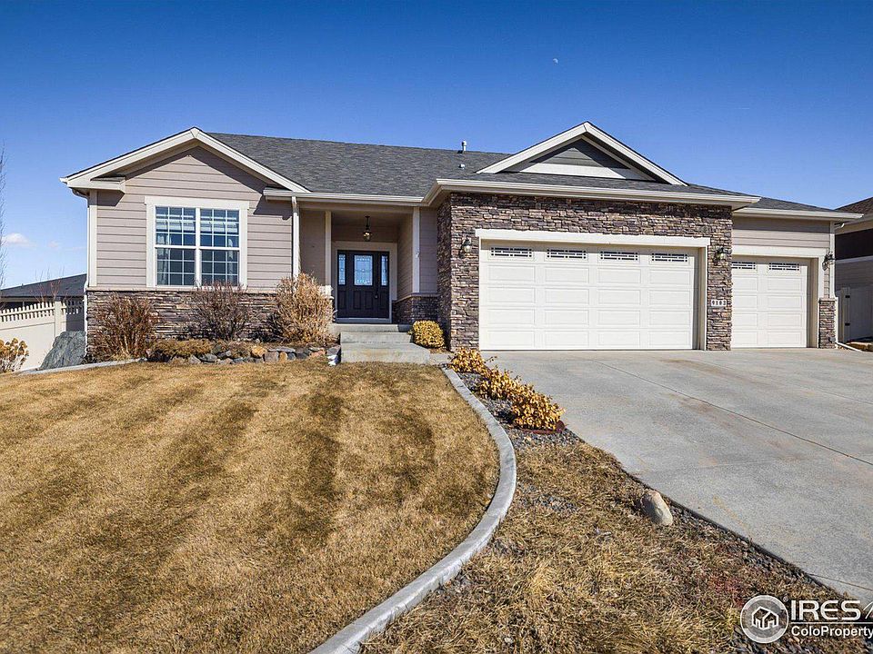 Welcome to this great custom built ranch style home in West Greeley. This beautiful home is located in Pebble Brook and offers an amazing floor layout with an oversized 3 car garage, you could even get 4 cars. Finished basement with custom wet bar and full size refrigerator with all soft closing drawers, along with two large bedrooms with full walk in closets and still room for an oversized storage room. The Primary bedroom is on the main floor and offers an en-suite with walk in closet. All doors are solid wood doors and offer a main floor office has French doors with custom built ins for the perfect office space. The home is in the Windsor school district and you are just a few minutes from Centerra shopping, Scheels and restaurants.
