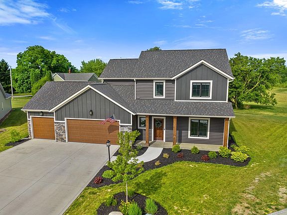 Nestled on a peaceful cul-de-sac in the desirable Lakes of Leo Creek neighborhood is this absolutely stunning 4 bedroom, 2.5 bath, 3 car garage Granite Ridge home. You’ll immediately feel the warmth and beauty upon entry. The eat-in kitchen boasts gorgeous quartz countertops, easy close cabinets, center island with a 6’ wide breakfast bar, and stainless-steel appliances. The den offers needed privacy with a sliding barn door and is an ideal office or reading space. The bright great room features a corner stone gas fireplace and beautiful views to your large backyard. All bedrooms are located upstairs including the master suite with cathedral ceiling, walk-in closet with built-in shelving, and charming single vanity ensuite. The 3-car garage is an organizer’s fantasy with $18k in upgrades. Consider the clutter gone with custom cabinetry, hooks, magnetic tool bar, utility bins, baskets and more. The LED lighting and epoxied floor are certain to impress. Enjoy entertaining family and friends this summer on your 18x10 patio and prep your lemonade for cozy conversations on your covered front porch. This dream home is ready for the taking!