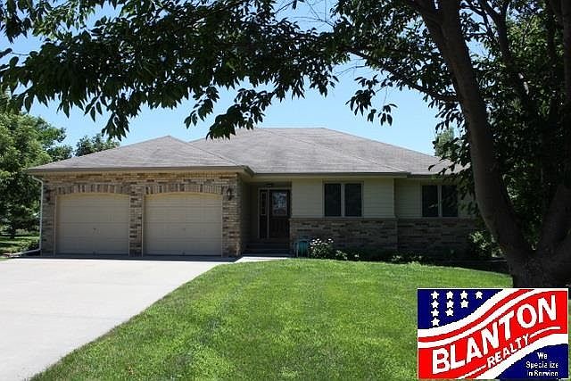 ** CALL Jim Blanton for more information (785-776-8506) or email blanton@flinthills.com **TOUCH OF QUALITY: HARD WOOD ENTRY AND STAIRS, CUSTOM CABINETS, VAULTED CEILING, EATING AND SERVING AREA IN THE KITCHEN, FORMAL DINING ROOM, JET TUB, LARGE CLOSETS, GOOD STORAGE, WET BAR IN THE BASEMENT, DAYLIGHT BASEMENT, AND BRICK ACCENTS. PELILA WOOD WINDOWS, GAS FIREPLACE, ..40 AC LOT SIZE, LANDSCAPED AND IRRIGATION SYSTEM. GREAT COUNTER SPACE AND ENTERTAINING AREA TO INCLUDE THE KITCHEN AND FAMILY R