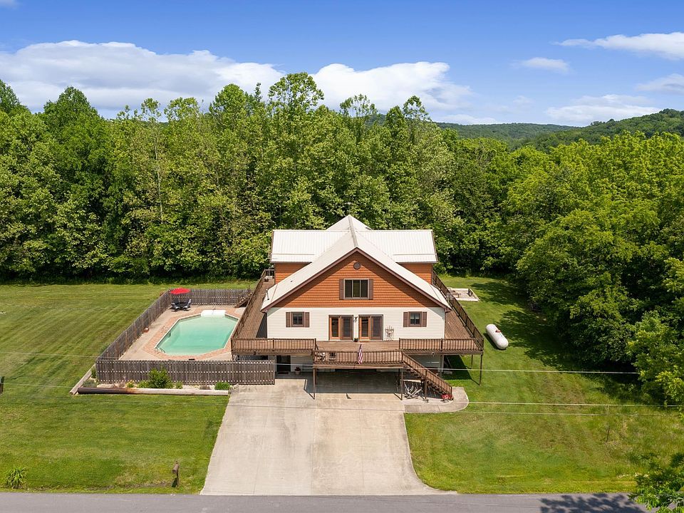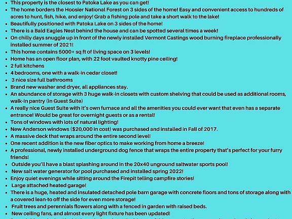 MOTIVATED SELLER!!! This beautiful home sits right next to PATOKA LAKE and borders the HOOSIER NATIONAL FOREST and offers some breathtaking views and plenty of opportunities for outdoor activities. With over 5000 sq. ft. of living space on three levels provides lots of space for families! This home features 2 full kitchens and 3 full bathrooms and 4 bedrooms. It has lots of features to offer. The game room is perfect for entertaining or enjoying some indoor recreation. This home has tons of walk-in closets and storage. Separate space downstairs that would make a great in-law suite or possible rental. The brand-new washer and dryer, along with all kitchen appliances, is a nice bonus. The property's natural lighting and wrap-around deck create a bright and inviting atmosphere. This home includes custom built-in shelving, a walk-in pantry, and windows galore. There is an underground dog fence. The outdoor features of the property are equally impressive. Splashing around in the 20x40 saltwater pool and gathering around the fire pit for campfire stories is a fantastic way to enjoy the outdoors. The massive, heated detached pole barn garage with ample storage, along with the covered lean-to, provides even more space for vehicles and equipment. This property offers a fantastic blend of natural surroundings, spacious living areas, and desirable amenities with being only 20 minutes from the casino & resort. It is an ideal place for nature lovers, those seeking a peaceful retreat. Sq. ft. is approx.