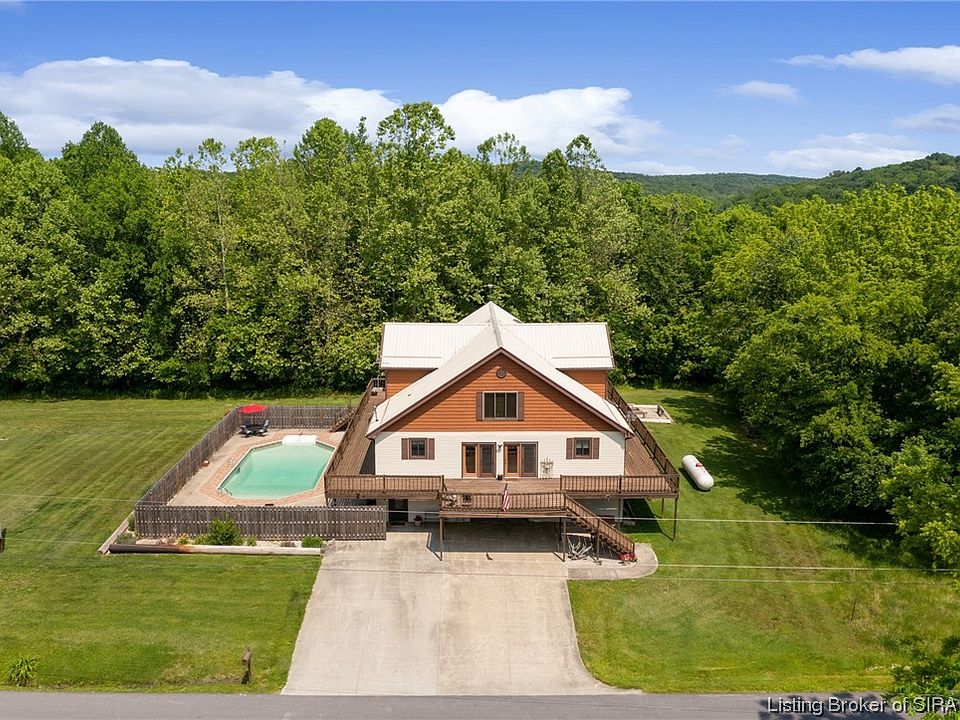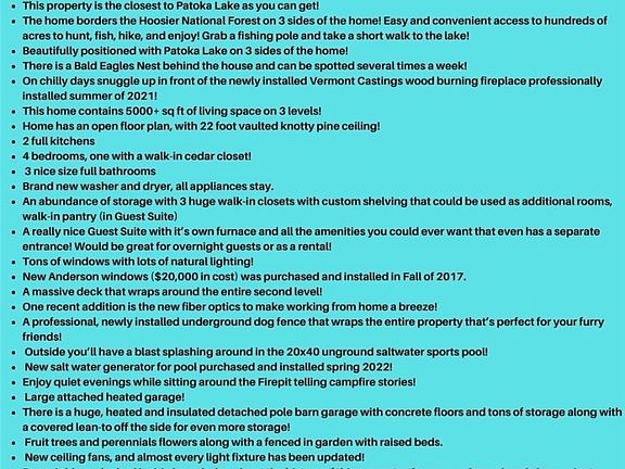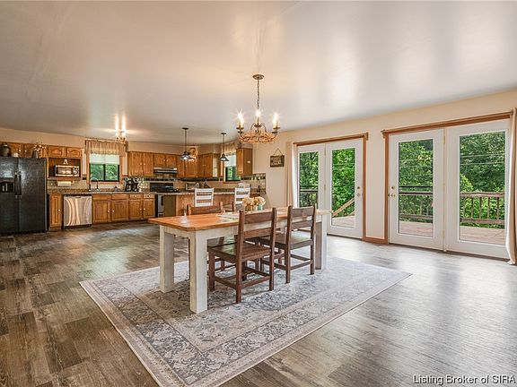 MOTIVATED SELLER!!! This beautiful home sits right next to PATOKA LAKE and borders the HOOSIER NATIONAL FOREST and offers some breathtaking views and plenty of opportunities for outdoor activities. With over 5000 sq. ft. of living space on three levels provides lots of space for families! This home features 2 full kitchens and 3 full bathrooms and 4 bedrooms. It has lots of features to offer. The game room is perfect for entertaining or enjoying some indoor recreation. This home has tons of walk-in closets and storage. Separate space downstairs that would make a great in-law suite or possible rental. The brand-new washer and dryer, along with all kitchen appliances, is a nice bonus. The property's natural lighting and wrap-around deck create a bright and inviting atmosphere. This home includes custom built-in shelving, a walk-in pantry, and windows galore. There is an underground dog fence. The outdoor features of the property are equally impressive. Splashing around in the 20x40 saltwater pool and gathering around the fire pit for campfire stories is a fantastic way to enjoy the outdoors. The massive, heated detached pole barn garage with ample storage, along with the covered lean-to, provides even more space for vehicles and equipment. This property offers a fantastic blend of natural surroundings, spacious living areas, and desirable amenities with being only 20 minutes from the casino & resort. Sq. ft. is approx.