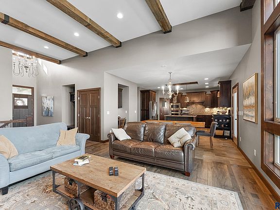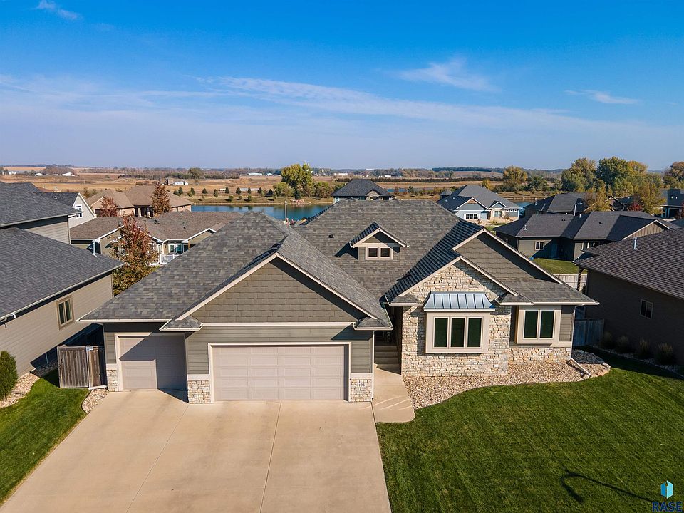 The epitome of entertaining homes in Cherry Lake Reserve. Designer finishes abound in this walk-out ranch home, complete with peek-through view of the lake. Floor to ceiling windows make a dramatic statement in the living room contributing to the open concept main floor plan. Built-ins throughout the main floor add a craftsman touch including the fireplace focal wall, drop zones and desk. Architectural ceilings in the kitchen and bedrooms add finishing touches. There are three bedrooms on the main floor including the master suite. Off the dining room is a covered deck, overlooking the fully fenced backyard. The complete bar, island and theater in the walk out basement make this the perfect host home. The BenQ projector and custom seating convey. Two additional bedrooms, and oversized storage finish the basement. Enjoy Cherry Lake, community beach and walking paths making this home a year round destination in Sioux Falls!