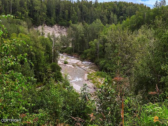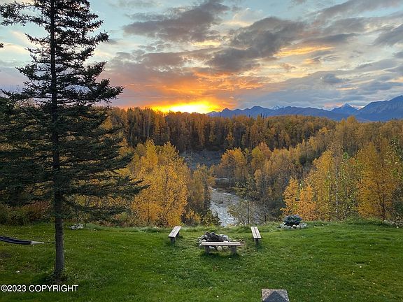 Experience Alaska from this peaceful escape only 10 minutes outside of Palmer. This home boasts two master suites, features an open concept kitchen and living room. You will love the hickory cabinets, concrete countertops, tongue and groove ceiling and the wood stove. The primary suite offers 12 ' ceilings, mountain views, with direct access to the sundeck.The bathroom has double sinks, a large walk in closet, a spacious tiled shower with rainfall shower head and smart controls. Turn on your shower before you even get out of bed with voice command. Moose creek is a beautiful winding creek that sees annual salmon runs, moose, bear and eagles. You can lay in your bed and watch the northern lights dance across the night sky. The second master suite features a 2nd walk in shower. The home has radiant infloor heat, a fireplace, and a wood stove, a new metal roof, apple trees, a circular driveway, storage shed and a back up generator. The yard is landscaped and the raspberries are ready for the fall harvest.   The remodel in 2020 added the massive 1000 square foot garage with high ceilings, the beautiful master bathroom and bedroom has cozy in floor heat. Slide into the hot tub and soak up the morning sun sipping on your coffee listening to the sound of the creek. The character that this setting offers is what most buyers are looking for when they choose to call Alaska home.   Just a few of the extras include:   A massive sundeck that overlooks Moose Creek and the  Mountains looking up the Matanuska River.   Fridge, washer and dryer and hot tub will stay Garage doors are 2-10' x 10'  and 1- 8' x 8' Flat Screen Tvs are included Smart switches  Furniture is negotiable Arctic entryway  The waterfrontage off the back of the property is a common use parcel that drops down to Moose Creek. See the Mat Su borough website. Per seller the septic is rated for 3 bedrooms  This location has access to state land in every direction. Access the backcountry on foot, wheeler or skis.