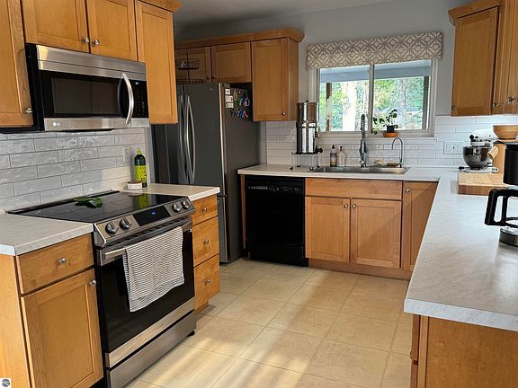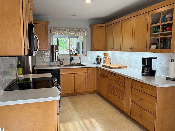 One of the finer units in the Villages of Oscoda! Remodeled kitchen with newer cabinets, countertops and backsplash, adjoined by a breezeway with half bath and storage leading to an oversized garage fully equipped with a heated epoxy floor and workshop area. Covered back deck with electric. Primary bedroom with private bath and bonus area currently used as a home office. Pecan hardwood floors are in great shape. Full basement with built in storage. Central AC, immediate occupancy, monthly dues are $77 and cover trash removal and lawn care.