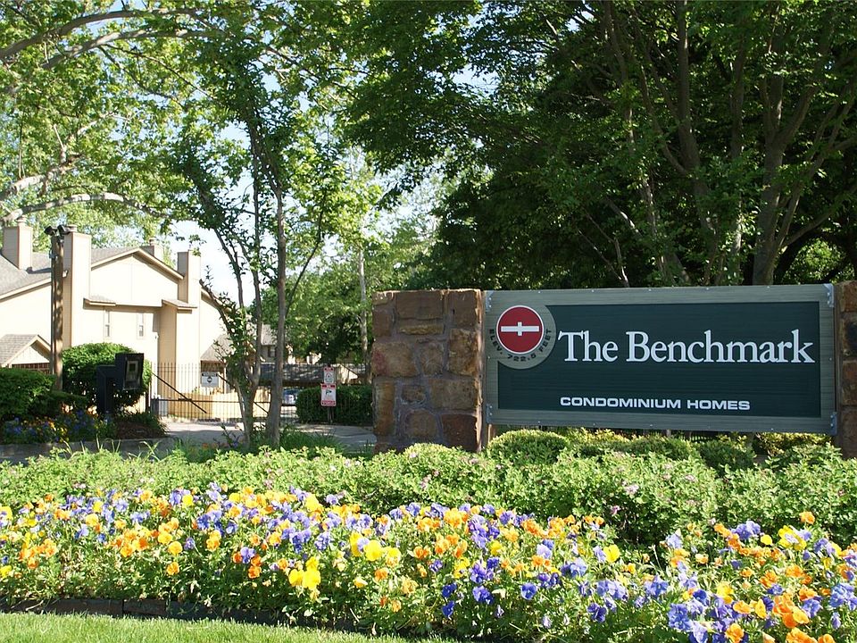 BENCHMARK Large Corner 2 Bdrm Townhouse, Master bdrm w/ private balcony, newer walk-in shower, trendy vanity in private bath. 2nd upstairs bath w/ newer tub & surround, vanity. Spacious Living rm, Fireplace. Updates needed. Bonus -Extra-large, extended courtyard. Reserved-Covered Parking close. BENCHMARK is a Beautiful Park-like Community w/Gated access, Pool, Clubhouse & On-Site Management. HOA Dues include extended cable, water, trash, exterior maintenance, patrol, plus more!