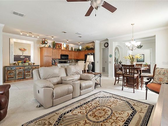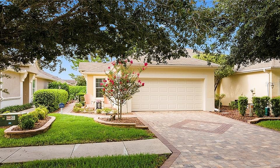 Augustus Villa 2+den/2/2 and this one is all dressed up and ready for viewings. Won't take long for you to fall in love with this home. Nestled into the very nice of Sante Fe, with a very private yard, you have all the custom upgrades outside that you could think of. Paver driveway and walkway to front entrance. Paver front patio is a great place to sit and meet neighbors walking past. Paver patio in rear yard, walkway to rear patio, custom landscaping surrounding the home that makes it so nice and private. Exterior lighting so that the home shines even in the evening. Covered, screened lanai will keep you out of the sun and rain so you can enjoy no matter the weather. Now let's talk interior. 8' entrance door, tile and carpet throughout, yes carpet as some prefer not to walk on hard surfaces at all times. Crown molding, custom lighting and ceiling fans, custom paint, custom window treatments, french doors to den, laundry cabinets, and custom solid surface surround in guest bath. The kitchen is the heat of this home and the open floor plan really shows it off. Exotic granite is the highlight, custom tiled backsplash, cabinets with crown molding, upgraded appliances, pendant lighting, SS sink with gooseneck faucet. You will really need to come look for yourself, I am sure you will not be disappointed.