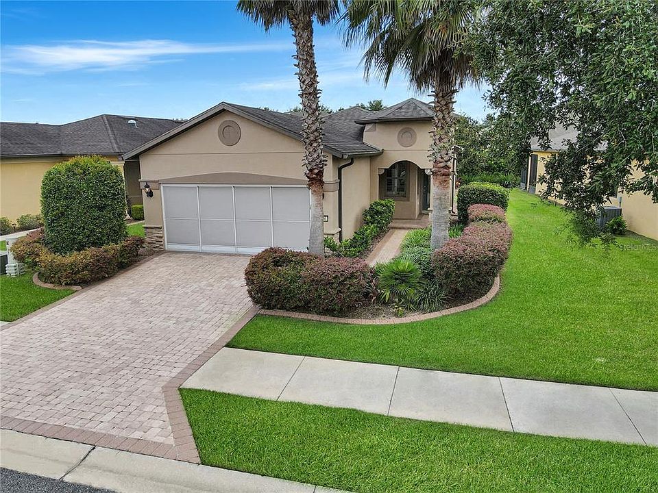 Taft Street Model in PRISTINE condition with beautiful curb appeal, located in Stone Creek by Del Webb. This home has 2 bedrooms, 2 baths, flex room, sunroom and extended 2 car garage. The home features crown molding in the main areas and bedrooms, Bali and LEVELOR custom window treatments, plantation shutters in flex room and tile flooring on the diagonal throughout. The kitchen has upgraded staggered cabinets, granite countertops, stainless steel appliances, pendant lighting and recessed lighting. Sunroom with custom light. Living room has ceiling fan and Nu-Flame Ethanol fireplace. Dining area has upgraded chandelier and Crate & Barrel Shelving & Bar. Flex room has glass French doors. Master bedroom has painted accent wall. Walk-in master closet. Master bath has tiled shower and granite countertop. Guest bathroom has tub and granite countertop. Laundry room with cabinets. Screened paver lanai with Cool-a-roo Shade. Extended paver patio. Front door retractable screen. Garage has epoxy floor, Storage cabinets by CCO Closets added in 2023, plus 3 overhead storage racks, additional wire shelving and garage screen. Paver driveway. Upgraded landscaping with palm trees. Exterior painted in 2021. New hot water heater in 2024. This home has absolutely everything you need and is move-in ready. Come see this gorgeous home today!