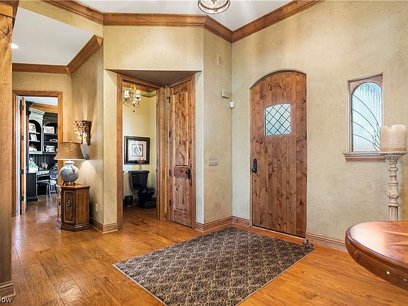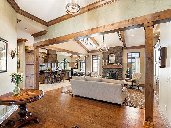 If you desire one floor living look no further! This gorgeous English Country Manor home was featured as the 2005 Designer Show House. Custom built by Mavrakis Construction this 4 bed 4 bath home possesses 4,688 sq ft including 1,674 sq ft in the finished walk out lower level. Upon entering the foyer you will be impressed by the wide open floor plan, beautiful hardwood flooring, two story vaulted beamed great room, floor to ceiling stone gas log fireplace, custom hand forged iron accents and much more. Eat-in kitchen is a chef’s dream! Mullet hickory stained cabinetry, granite counters, stainless steel Electrolux appliances, large island and bar area. The breakfast room walks out to the upper back patio that overlooks the very private backyard. Spacious owners suite and bath with walk-in tiled shower, jetted tub, and dual vanities. Office/library and laundry room also located on main level. Walk out lower level is an entertainers delight with large family room, gas log fireplace, b