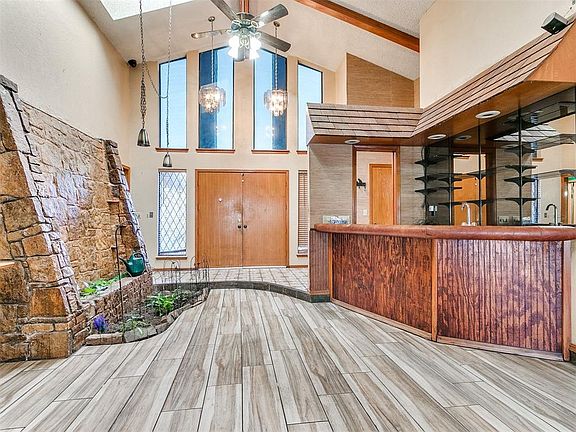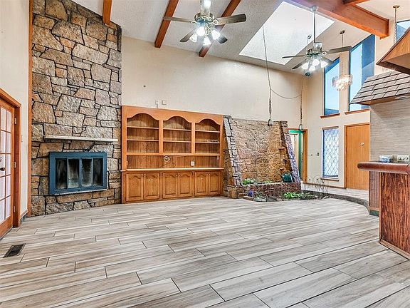 Sprawling Ranch Style Home. Impressive soaring stone columns make a grand statement in a large front courtyard area. Circle drive for extra parking. Large living area with built in large rounded bar area that gives off a vacation vibe. Kitchen includes fridge and an impressive gas Jenn Air built in stove top. Large primary bedroom that connects to enclosed patio 238 sq ft which is included in square footage. This house has tons of potential , seller prefers to sell not making repairs, but open to inspections. Roof is 2013 and was recently inspected. Tankless hot water tank. Storm Shelter located on east side of home.