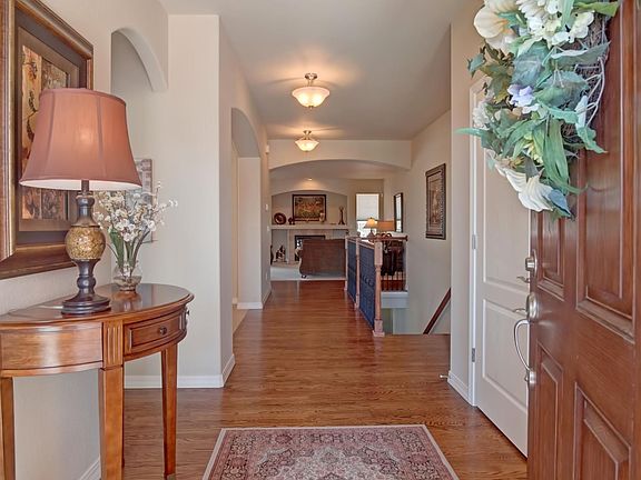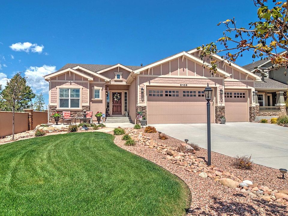 This is one of the most pristine well maintained homes, its feels like you've walk into a model home but better because it already has professional landscaping & window treatments! Situated on a cul-de-sac next to the walking trails in the desirable Cordera neighborhood this stucco exterior rancher has lush landscaping & views of Pikes Peak. Main level has an open floor plan with hardwood floors & a gourmet kitchen. Kitchen has an oversized island with granite countertops, under mount lighting, pantry, stainless steel appliances, smooth top range, overhead hood, & side by side refrigerator. Separate formal dining room off the kitchen has a curved doorway leading into the kitchen. Living room is bright & has a gas fireplace. Main level laundry room has upgraded cabinetry & a sink. Main level master bedroom has an adjoining five piece bath with walk-in closet. Master bath has tile flooring, tile countertops, garden soaking tub, & a bench in the shower.