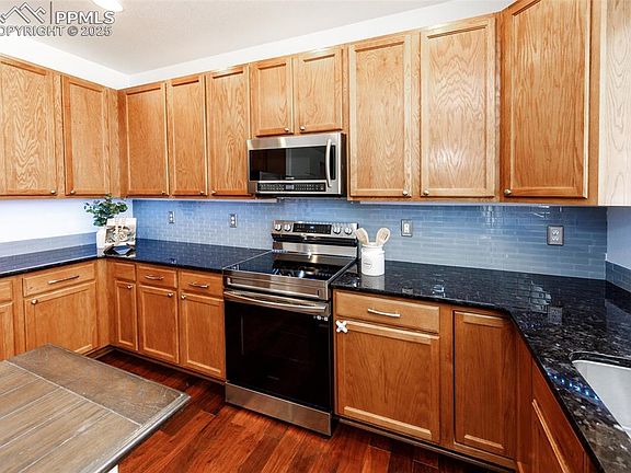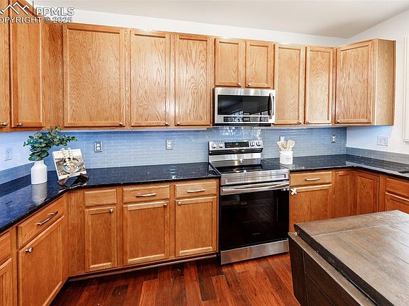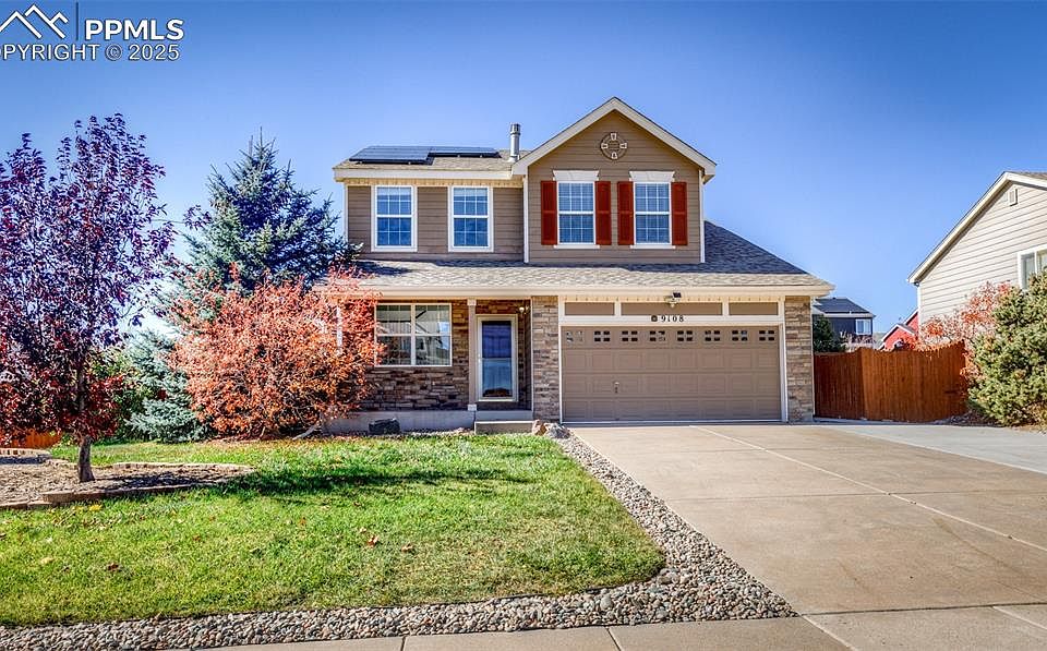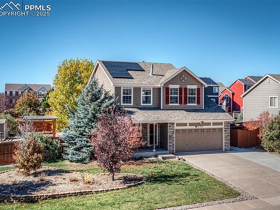 Spacious 2-story home on a corner lot with 4 bedrooms, 4 bathrooms, and a finished basement offering over 2,800 sq ft of living space. This home combines thoughtful updates with inviting style. The exterior features a Class 4 roof, solar panels, an extended parking pad, and a sprinkler system. The fenced backyard is an outdoor retreat with a covered patio wired for speakers, hot tub, greenhouse, garden beds, shed, wood pergola with raised deck, and low-maintenance landscaping with mature trees and artificial turf. Inside, the main level offers a flexible front room with hardwood floors and recessed lighting—perfect as a formal dining or bonus living space. The large family room features hardwood floors, a gas fireplace, ceiling fan, plantation shutters, and built-in surround sound wiring. The kitchen boasts abundant wood cabinetry with pull-out inserts, granite counters, stainless appliances, movable island, glass tile backsplash, and pot rack lighting. A convenient laundry area and updated half bath complete the main level. Upstairs, the primary suite impresses with a sitting area, double-sided fireplace, ceiling fans, and an attached bath featuring dual sinks, a walk-in tiled shower, and a spacious closet. Two additional bedrooms share a full updated bath. The finished basement expands the living area with a kitchenette, built-ins, full bathroom, and flexible family room or 4th bedroom with egress window, closet, and projector mount. Additional features include new 2025 water heater and A/C, whole-house humidifier, finished garage with storage, and 6-panel white doors throughout. This well-appointed home offers space, function, and a beautifully landscaped outdoor haven—ready for you to move in and enjoy. Community center, fitness center, pool, golf course, and many shopping & dining options nearby. Easy commute to air force bases or into Colorado Springs!