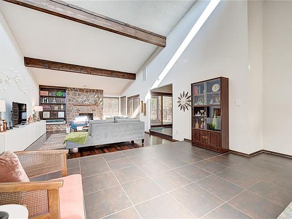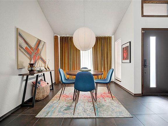 Light and bright mid-century modern jewel! Well maintained and move in ready. The charming oversized living room welcomes you with an airy and bright vaulted ceiling. Open to the kitchen + dining and anchored by a fantastic fireplace and wet bar the space is ideal for gathering friends and family. A fabulous kitchen offers double ovens, a smooth top stove, terrific storage and a perfectly placed window over the sink. Glass doors to the covered back patio and generous yard space extend your living options outdoors. Updates throughout include new barn door in primary bathroom, low maintenance landscaping and fresh exterior paint. in-ground storm shelter for safety and security. Neighborhood HOA includes a pool and park and walking distance to Wiley Post Elementary.