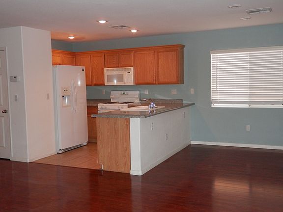 Three bedrooms, 2 1/2 baths, open floor plan with dark wood/laminate flooring, window coverings throughout, all appliances included, refrigerator, washer, dryer & microwave. Cozy patio for your BBQ & table.