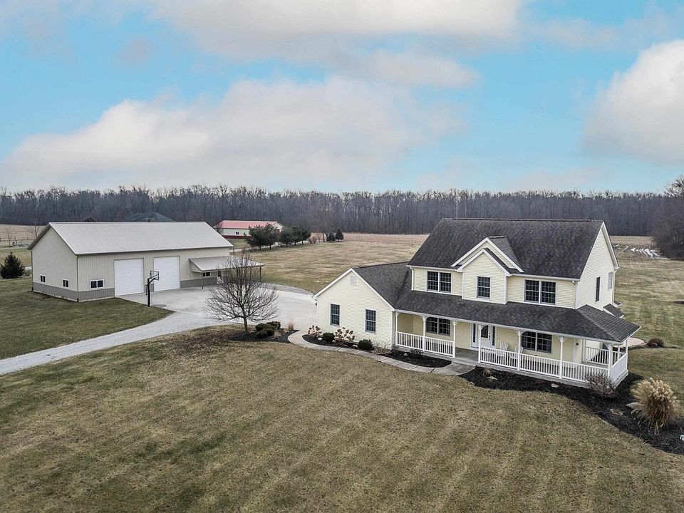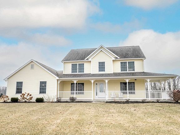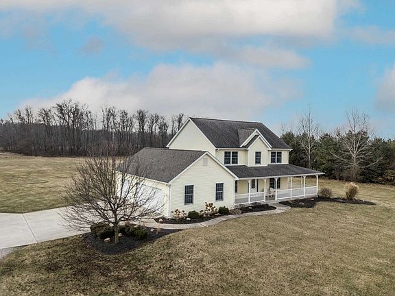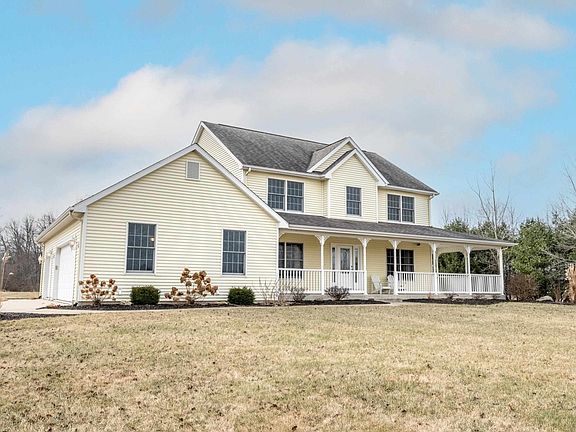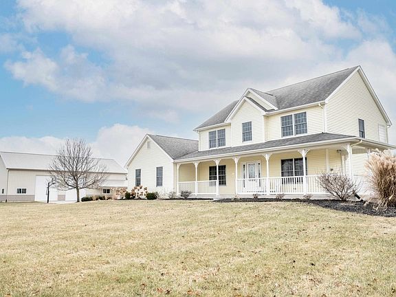 The perfect rural home on over 5 acres, set back off the road nearly 1000' , 4 bedrooms, full finished basement, geothermal and 67 x 40 pole barn. The kitchen features all the appliances, seating at the counter top bar as well as a table and chair breakfast nook all open to the living room. The living room has built in shelving on both sides of the gas log fireplace with a door that leads to the deck, which features the hot tub. The formal dining room off the kitchen could also be used as a den. There is a bedroom on the first floor with custom shelving as well as a closet. The other 3 bedrooms occupy the upstairs, including the master suite with double sinks, separate tub and shower, and a walk in closet. The daylight basement is finished and partially plumbed for a 4th bathroom and offers an additional unfinished area full of shelving for all your storage needs. The pole barn/shop is what any car or hobby enthusiasts seeks. It is 67'X40'X16' tall with a 40'X20' workshop area featuring geothermal heated floor that is epoxy sealed, spray foam insulation, plenty of lighting, a half bath and plumbed for another sink basin. The open area of the shop (cold storage area) offers two 14' overhead doors, 6" heated concrete floor and a 20'X40' upstairs storage area. This home has everything to offer with room to roam! Call and schedule a tour today!