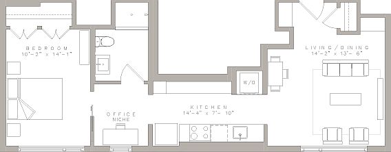 This plan includes one bedroom, one full spa inspired bath, custom European style kitchen and office niche.