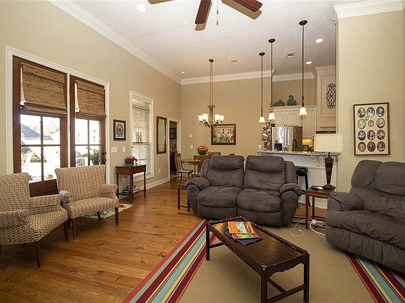 Come see this stunning home in Abundance Pointe. Professional landscaping both front and back yard. As you walk thru the front door you will see beautiful fireplace with gas logs for a cozy Winter nights. This is a split plan. A beautiful barn door leads to the other three guest bedrooms. All bedrooms are good size. The bath between bedrooms has two beautiful separate granite vanities. This bath has double doors with a private shower and water closet. Carpet only in bedrooms. Wood in all other areas of home. The family room and kitchen are an open plan. The kitchen has beautiful granite counter tops with tumble stone back splash. Gas stove top has five burners, which is a plus. Refrigerator remains. Vent hood is very pretty and owner is leaving ornamental fixture above vent hood. Master bedroom is spacious. Master bath is really nice with beautiful granite and two vanities. Separate water closet. Shower is beautiful with glass door, amazing tile work and pebble stone floor. Master closet is large with two built-ins and shelving above both. Laundry room is adjacent to master closet for extra convenience. Just off laundry room is a sit down office desk with cabinets and shelves above. Owner enlarged patio area to make space larger & included two brick benches for great entertaining. Great storage area in garage. Large enough for extra refrigerator or freezer. This home has so many extras, gutters, irrigation system and only steps away from HOA Clubhouse and beautiful swimming pool. Call you realtor today to see this beautiful home.