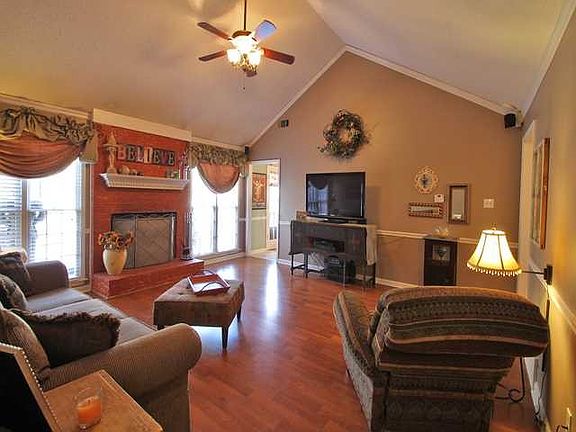 Beautifully maintained brick l level home. Fresh paint outside. Large vaulted Great Rm w/fireplace, large eat-in kitchen w/island/breakfast bar/tons of cabinets/tile floor, 3 bedrooms, 2 baths. Vaulted master BR with luxury bath. Laminate floors. Fresh paint. Custom molding, 2" blinds, security system, laundry room w/cabinets, 2 car garage. Heat and air only 1 year old. Ceiling fans in every rm. Private back yard with huge deck and above ground pool. Refrigerator stays but not warranted.