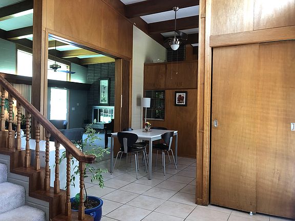 Mid-century gem with open floor plan and vaulted ceilings in quiet neighborhood with mature, tree lined streets. Mahogany woodwork with many built-ins and storage throughout home. Large bedrooms with oversized closets, master has his and hers with walk-in. Office/hobby room off kitchen with built-in storage and tons for counter space for any project. The basement has a home theater/rec room and includes a wet bar, laminate floors throughout and is great for entertaining. Large lot with fenced backyard and covered patio. One of a kind with too many updates to list! Seller reserves projector screen and projector in basement room, white kitchen island and outdoor swing set.