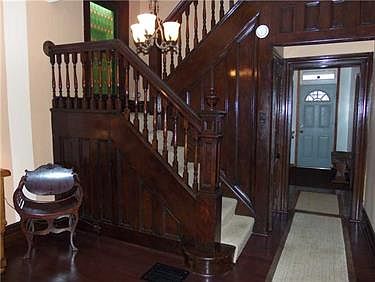 Stately brick beauty in immaculate condition; all the charm & character of days gone by but w/ all the modern conveniences; grand entry hall w/ leaded & beveled glass door & a stunning staircase of all original woodwork; pocket doors to lv/dn room combo w/ 2 beautiful deco fireplaces & hardwood flooring; tall, updated hickory cabinetry, breakfast bar & a butler's pantry; huge upper bath tastefully done; finished 3rd floor offers spacious, private sleeping accommodations; det.grg & off street parking