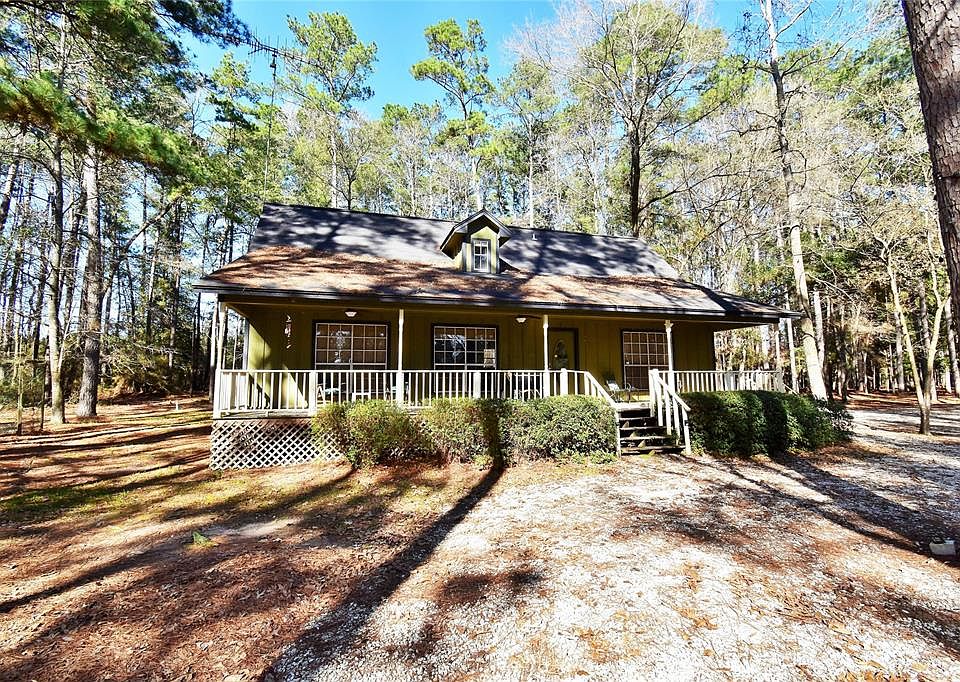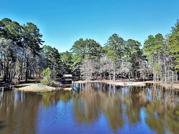 Adorable Ranch Style Home overlooks the Beautiful and Grand Stocked Pond w/Gazebo Bridge that stretches across lake for a walk-across. Wind through the Plantation Pine Forest to the Cabin nestled in the Woods. Sitting Porch expands the entire front of home overseeing the Property, an amazing serene and peaceful setting. Enjoy this Open Concept Living/Dining - huge area for entertaining with 4 Bedroom/2 Full Baths, Full Kitchen with Breakfast Bar. Covered Front and Back Porches. Road winds down and around to the Metal Storage Shed and Original Old Cabin, now used as Gameroom/Party House - renovate and make a great Guest House! Large Cleared Pasture flanks the side for stock, hay fields or hunting, lots of wildlife. Property is surrounded/buffered by woods, mostly fenced. Auto Gate Entry welcomes you. Property has been used as a Weekend Family Retreat, would be great Residence as well. This is a rare and one-of-a-kind find, offers all the pleasures of the country. Extraordinary.