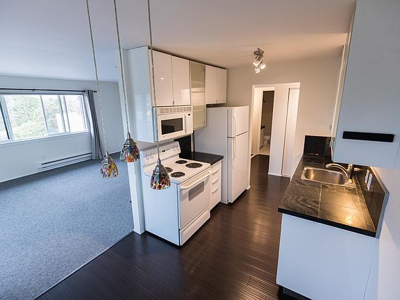 Spacious top floor corner unit with views of Green Lake, Cascades and Mt. Rainier. Bright natural light in living spaces. Tastefully updated kitchen with chic white cabinets and slate countertops. Tweed carpet and durable espresso laminate flooring. Insulated Hunter Douglas blinds throughout along with newer sliding closet doors. Deck off of living room. Ample additional storage in basement and deeded parking included. No rental cap. Two pet limit under 35 lbs. Enjoy the city life at an affordable price.