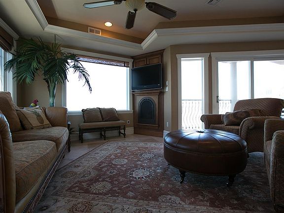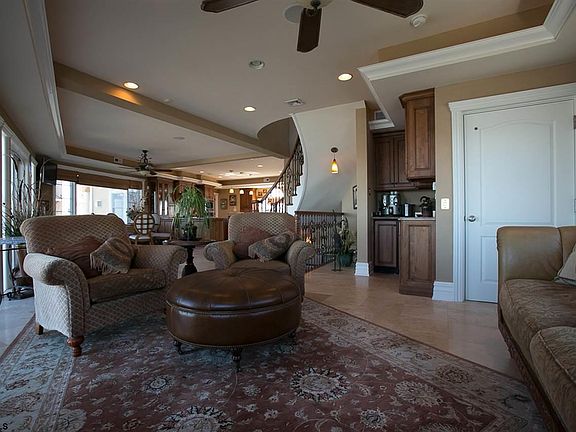 Upon entering through the classic mahogany double doors it is readily apparent the amenities, quality of craftsmanship, attention to detail, materials used, and over all architectural design places this property amongst the finest on the island. Exterior features- Private beach, Circular paver driveway, dual garages with old world style doors, stacked stone foundation, wrought iron railings and gates, terra cotta roof. Relax on the enormous wrap around deck capturing direct and panoramic open bay which leads to a pier accessing 2 deep water slips and boat lift. 1st level offers Cozy family room with custom built-ins, master suite with dynamic bay views, laundry room, elevator access. 2nd level- Main Living Area boasts breathtaking panoramic bay views from every angle, 2nd master suite, office/bedroom with amazing wainscoting, custom built-ins and fireplace, the kitchen is stylish and elegant boasting upgraded stainless steel appliance, hand crafted cabinetry with intraget moldings and trim boards, task and accent lighting, double tier granite breakfast bar, wine chiller and walk in pantry. 3rd level- is solely dedicated to the fabulous Master suite which is beyond belief. With soaring ceilings, large sitting area, luxurious bath which includes Jacuzzi, bidet, steam walk in shower, private gym and 2 walk in closets. Offering forever bay and Atlantic City skyline views,