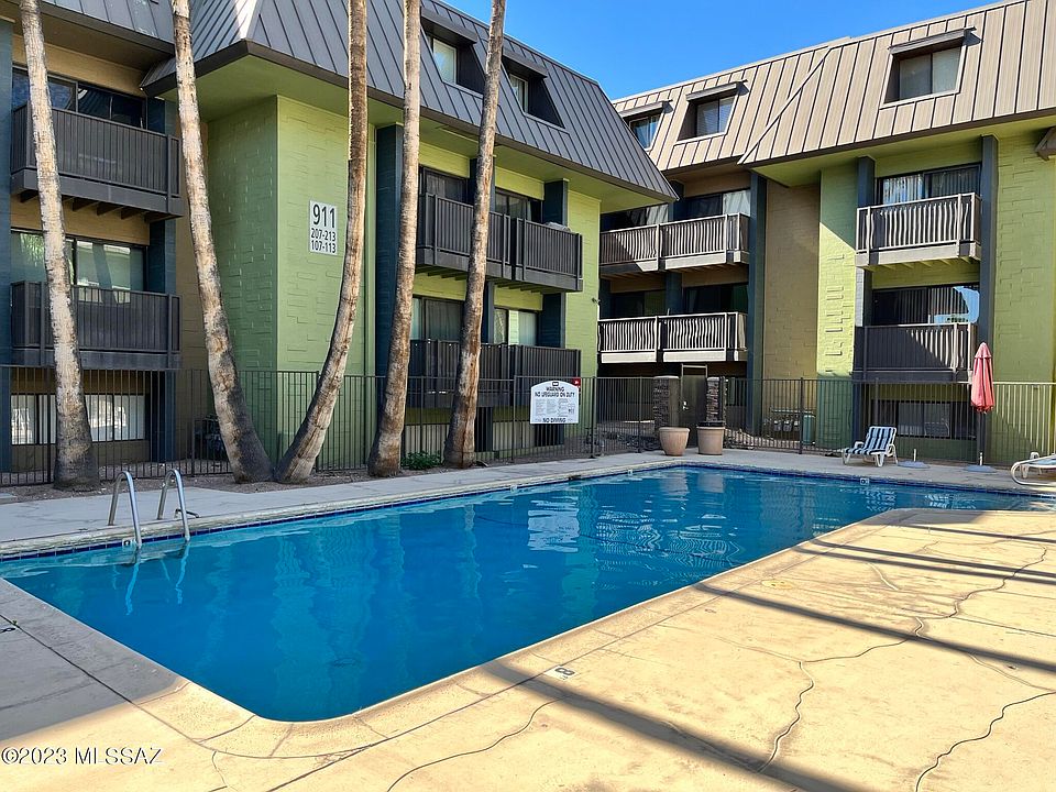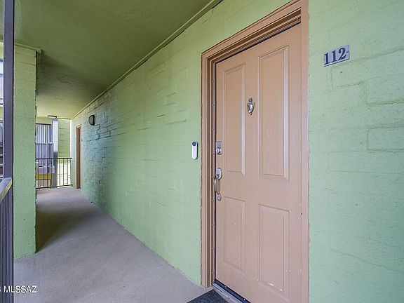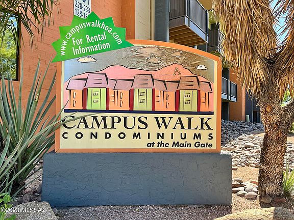 Amazing opportunity for move in ready 1,086 SqFt 2 bed/1.5 bath concrete contemporary condo in gated Costa Del Sol Condominiums, the Campus Walk. Located one block from Main Gate Square in desirable West University neighborhood, walk to the University of Arizona, 86 Walkscore (2nd highest in Tucson) and a 100 perfect Biker's Paradise and 4 minutes from Sun Link streetcar. Monthly HOA dues include refreshing community pool, secure gated entrances, internet, cable, sewer, trash, water, roof, reserved parking spot #69, onsite laundry room, bike racks and student lounge clubroom (rentals are allowed). Solid concrete block construction, located in the back of complex, quiet with no road noise. Inside buyers will appreciate: new electric HVAC 2021, digital thermostat, painted textured ceilings (no popcorn), updated LVP plank flooring, wood baseboards, large living room, balcony overlooking sparkling pool and massive palm trees, dining area, rare internal laundry closet w/stackable washer & dryer included (only a few units have these), dining area, upstairs half bathroom, wired for alarm, updated modern kitchen with granite countertop, granite bar seating, updated modern hickory kitchen cabinets, electric oven, built-in microwave, double stainless steel sink and garbage disposal. Downstairs there are two spacious bedrooms, ceiling fans and primary bedroom has understairs "Harry Potter" walk-in storage space in addition to closet, full guest downstairs bathroom with matching granite countertop, dual sink updated modern hickory vanity, exhaust fan and shower/tub. Fantastic solution for those looking to secure housing walking distance to the University of Arizona, minutes from Banner Medical, thriving Downtown Tucson and quick access to I-10. Review the 12 documents in MLS and call to make an appointment to view the lowest priced condo available in the Campus Walk complex today.