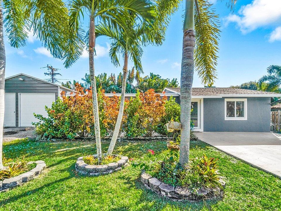 TWelcome home!! This completely renovated 3 bedroom 2 bathroom CBS single family home offers a light wood tile throughout, a completely remodeled kitchen with real wood cabinets, quartz countertops and modern dark stainless appliances with custom lighting. The extremely spacious owners suite has a remodeled en-suite bathroom and a walk in closet with custom shelving and drawers. Situated on a spacious corner lot there is and a MASSIVE detached garage/work shop.
