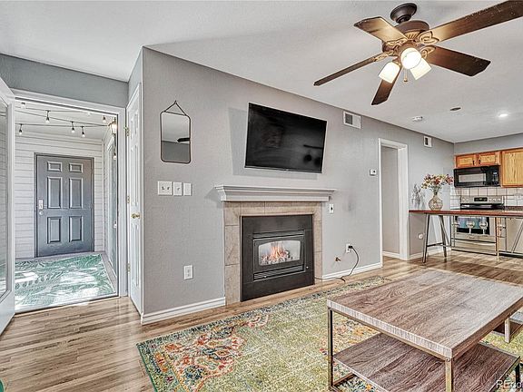 Amazing location in the heart of DTC. Four minute walk to light rail. Enjoy the newly constructed park and many paths to open/ picnic spaces along the Tommy Davis Park Trail. Top floor with treehouse like views. New carpet and ALL new paint in interior. Drink your morning coffee on your open patio that looks East. One bedroom, one full bath and family room with fireplace. Bedroom has slider to patio and a large walk in closet with barn door. Kitchen has stainless appliances and the microwave is newer. This adorable condo has a stackable washer and dryer in unit. There is a beautiful pool, workout area and fabulous clubhouse. This perfect little subdivision has a HOA that is taking great care of the subdivision. Entire neighborhood is clean and manicured. Close to I25 for easy commute.