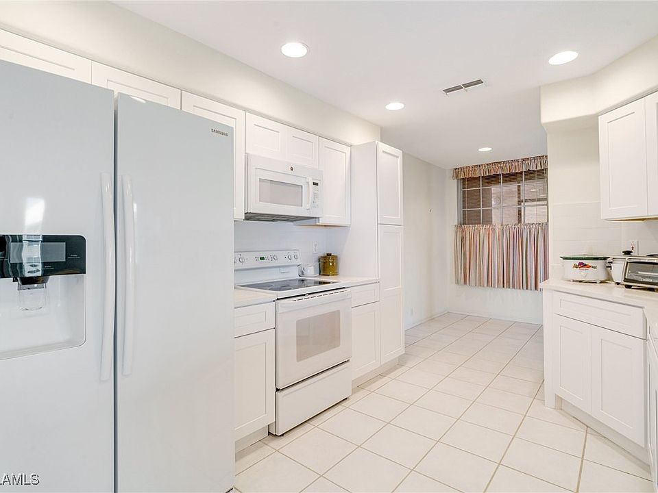 Rare Bimini Floor Plan in Lexington Country Clubs Lake Village. Tile flooring throughout the main living areas and wet zones, with carpet in the bedrooms. The kitchen has been completely renovated with brand new cabinets and quartz countertops, complemented by white appliances. The breakfast bar offers casual dining space in addition to the formal dining room. The primary bedroom features a luxurious bathroom with dual vanity sinks, a standup shower, and a spacious walk-in closet. The guest bathroom includes a convenient shower/tub combo. The third bedroom, equipped with French doors, provides versatility for guests, a home office, or whatever suits your needs. From your Bimini, enjoy breathtaking views of the lake, community tiki hut, and tranquil water fountain. For peace of mind during storm season, the property includes a combination of manual and electric hurricane shutters. The HVAC system is practically brand new - a 3½-ton, 16.5 SEER air conditioner installed in October 2024 ensures efficient climate control year-round. Additional Storage closet right outside your screened entry area. Lexington Country Club is a 24-hour gated community and is located within minutes of the beaches, shopping and and just 1.2 Miles from HEALTHPARK Medical Center and Golisano Children's Hospital
