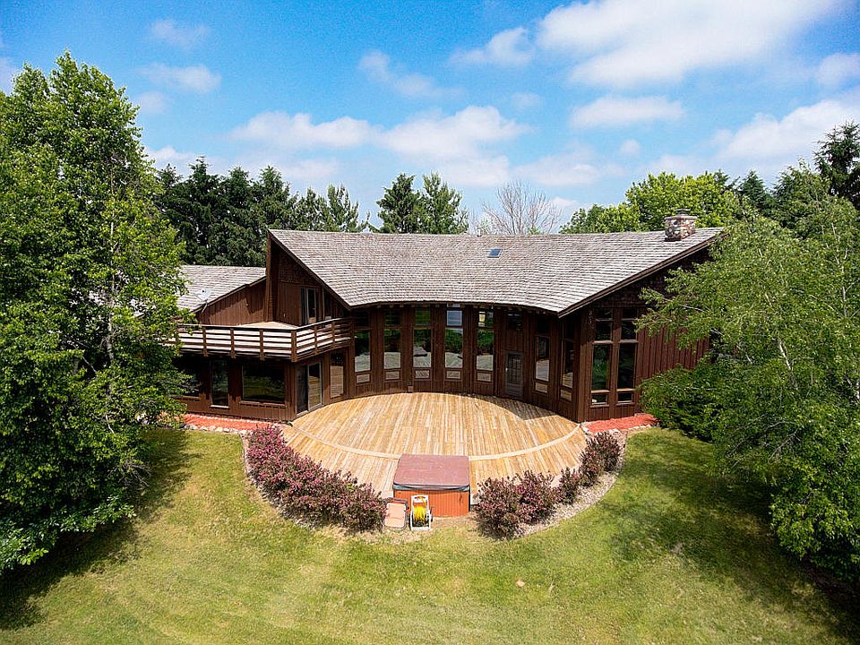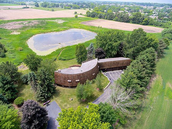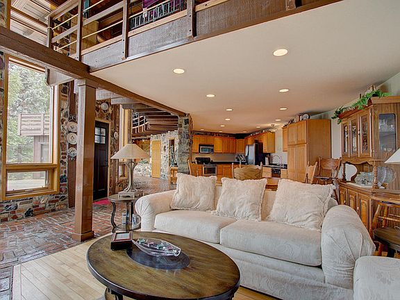 Dare to be different. Hemicycle Frank Lloyd Wright inspired design. Nothing ordinary about this custom passive solar home. Be WOWED by the two stories of windows, vaulted ceilings, exposed beams. One of a kind hand picked ''Rubble Stone'' for walls and FP. 2400 feet of Hand Hewed exposed beams, intricate brick floors, & custom doors. All this carefully tucked away for privacy on 2.8 acres with pond. Huge circular deck to entertain, as well as a second story deck for more spectacular views of the hillside and pond. This is an amazing unusual home for someone who dares to be different.