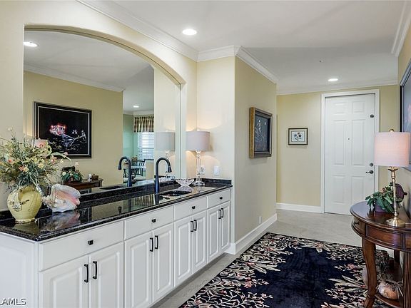 Located in Lexington Country Club with “Pay as you Play” Golf access. This stunning 3-bedroom, 2-bathroom Sutton Walk condo offers exceptional unobstructed views of the Fort Myers Beach skyline. Serene lake vistas, perfectly complemented by a backdrop of the preserve comfortably viewed through a hurricane impact living room picture window. Step inside to discover a wealth of upgrades including a new AC unit, a newer water heater, and reverse osmosis system. The kitchen is a chef's delight with granite countertops, white cabinets, stone backsplash, and newer stainless steel Whirlpool appliances. Kohler sinks and faucets add an extra touch of elegance. The living spaces boast crown molding, 6-inch baseboards, 24 X 24 porcelain tile floors with a rectified edge in the living areas, and cherry wood floors in two of the bedrooms. Comfort meets style in the bathrooms which feature comfort height toilets and a master bath with a seamless shower enclosure. Entertaining is a breeze with an 8-foot wet bar with granite countertop in the main living area, and a lanai equipped with tile flooring, no-see-um screen, and accordion storm shutters — ideal for enjoying the outdoors no matter the weather. Additional features include an oversized garage with extra storage, a sentry floor safe, and built-in cabinet and desktop in the den, perfect for a home office setup. Lexington Country Club has a range of amenities and is a 24-hr. gated community located within minutes of beaches, shopping, and medical facilities.