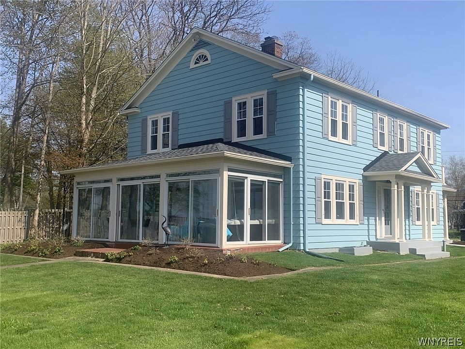 Experience breathtaking sunsets from your own 92 feet of beautiful beachfront, all without the hassle of stairs! The current owners have tastefully renovated much of this home while preserving its charming character & integrating numerous modern amenities. The kitchen has been expanded to feature a 12-foot island/breakfast bar, adorned with marble and granite counters, some newer glass cabinets, hardwood floors, new light fixtures, and stainless steel appliances. Entertain in the spacious dining room and living room, complete with a custom gas fireplace, or unwind in the inviting sunroom. There are four bedrooms, two of which offer stunning lake views, and updates to both full baths, comfort and luxury abound. The 2-car garage includes a 500-square-foot carriage house w/kitchen, living room, & two additional bedrooms. Recent updates include a new roof, exterior paint, and a tank less hot water heater installed in 2023. The property boasts underground sprinklers, landscaped grounds, & a rebuilt seawall.