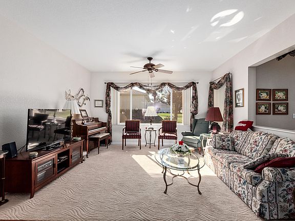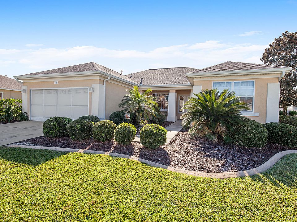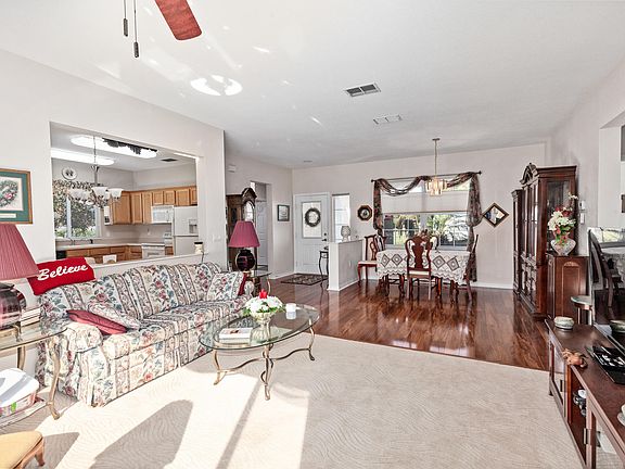 GREAT LOCATION IN DEL WEBB SPRUCE CREEK GOLF & COUNTRY CLUB. Close to Clubhouse, Pool and Pro Shop. Meticulously maintained San Mateo model. Upgraded oak cabinets with crown molding & pull-out shelves. Livable split bedroom floor plan with bay window in master bedroom and more. HVAC replaced in 2013. Roof re-shingled in 2013. Extended garage with screen, pull-down attic access steps for attic storage. Nicely landscaped with curbing around plant beds. Small patio for grilling. Furniture available and turn key. Monthly HOA will be $135.00 includes security, common area maintenance, trash removal and use of the amenities.
