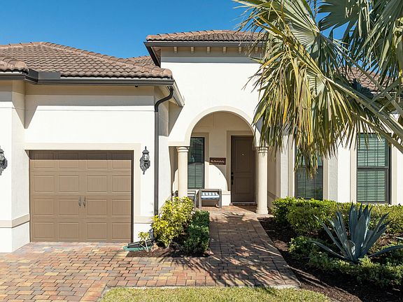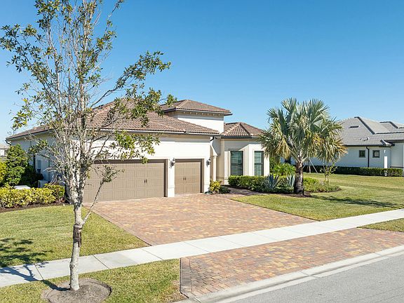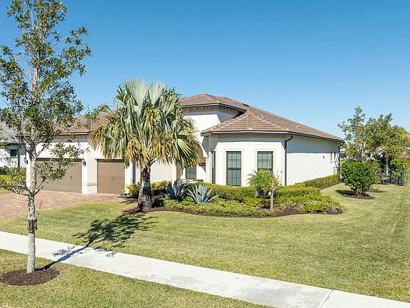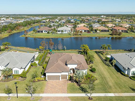 Beautifully appointed waterfront home that epitomizes the very best of Florida living!Welcome to this breathtaking luxury residence, meticulously designed to provide the ultimate lakeview living experience. The luxurious Interior features a gourmet kitchen custom-designed with an entertainment corner, trash pullout, and sleek stainless steel appliances, including a gas cooktop and microwave/wall oven.Upgraded 9''x40'' plank tile flooring is perfect for effortless entertaining and everyday living. The den offers a custom built-in with French doors for the perfect home office setup. The Zero-corner glass sliders open to a resort style oasis with an oversized custom pool overlooking a spectacular lake beneath an endless Florida horizon. Designer touches include exquisite wallpaper in living areas and bathrooms for a touch of elegance. Owners suite features custom closet with private storage area and a spa-inspired owner's bath with waterfall shower head.