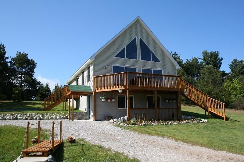 Much living space in this well-cared-for home. 2500+ sq ft w/ 4 br; bathrm on every level. Open flr plan w/ Pella windows & sliders overlooking a beautiful deck & 10 acres. Kitchen island provides addtl work area & seating. Vaulted living room & loft sitting area off mstr br offer architectural detail. Finished lwr level houses office w/ wireless DSL internet, family room, & 4th br w/ bath - perfect for guests! Add to this the 30' x 72' finished polebarn w/ rec room. 2 miles to Crystal Lk & dwtn Beulah.