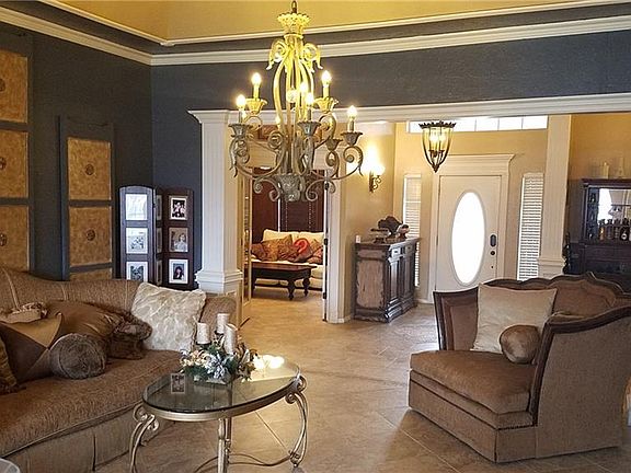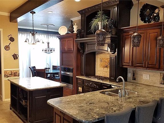 This stunning home is a MUST SEE! The moment you step inside you can see the care the current homeowner has taken to make this a home with many luxurious features. 4 bedrooms with an extra room upstairs that could be used as a 5th bedroom - 3 1/2 baths - 2 Kitchens - 5 LIVING AREAS that are currently being used as 1)Office 2)Formal Living 3)Family Room 4)Game Room 5)Theater - 2 Dining Rooms - 4 Car Garage W/ Storm shelter. Main kitchen features oversized island with granite counters and travertine backsplashes, tons of storage and gas stovetop with pot filler. Upstairs you will find a large home theater with platform for raised seating and room for a 120 inch projection screen. In addition to the theater is a full game room large enough for a pool table and additional seating. Next to the game room is a 2nd full kitchen with Stove, Dishwasher, Fridge and more storage. After viewing the inside step outside into you personal OASIS with inground pool, hot tub, sound system&MORE