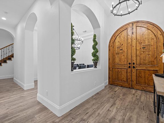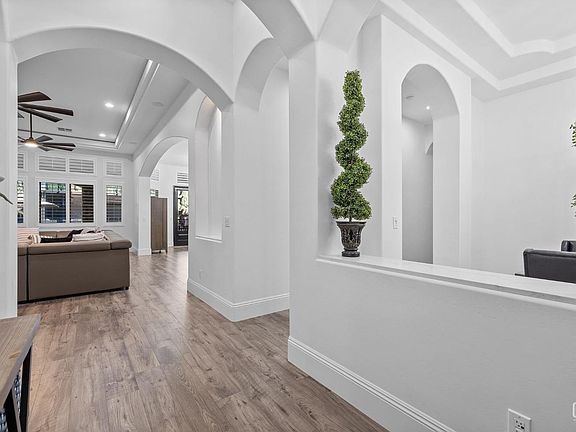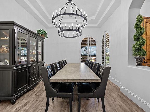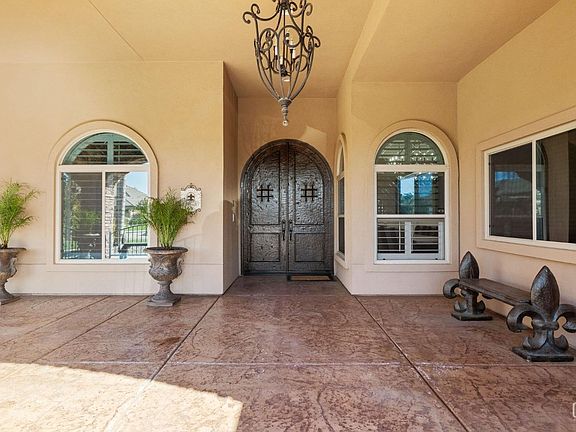 Experience elegance in this custom-built Northwest home on a serene cul-de-sac. Owned solar, plantation shutters, and solid teak doors highlight its craftsmanship. Enter through a grand arched entryway to an open floor plan with new flooring, fresh paint, recessed lighting, and trey ceilings. The living area boasts built-ins and luxury vinyl plank flooring. The remodeled chef's kitchen features KitchenAid appliances, a built-in fridge, double ovens, a 6-burner stove, pot filler, pantry, and a large island. With 5 bedrooms and 5.5 baths, the primary suite includes an office, walk-in closet, steam shower, soaking tub, and double-sided fireplace. Enjoy a theater room with bar, microwave, and mini fridge. Outdoors, find artificial turf, a covered patio, fire pit, outdoor kitchen, pergola, spillover spa, and pool. The RV parking and workshop with laundry, bath, and upstairs game room add versatility. A 3-car garage with a salon completes this luxurious, functional home.