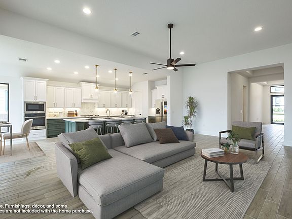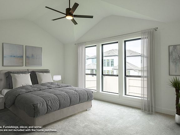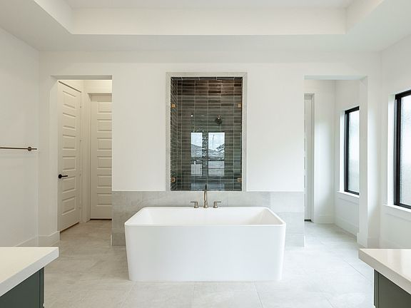 Welcoming entry and extended entry with 12-foot coffered ceiling. Spacious family room with a wood mantel fireplace and sliding glass door opens to the kitchen and dining area. Island kitchen offers a walk-in pantry, 5-burner gas cooktop and built-in seating space. Dining area just off kitchen with walls of windows and a gorgeous backyard view. Secluded primary suite with a wall of windows. French doors lead to the primary bath with dual vanities, freestanding tub, separate glass enclosed shower, a linen closet and two walk-in closets. Large game room with French doors. Secondary bedrooms with walk-in closets, utility room and a Hollywood bath complete this spacious design. Extended covered backyard patio. Mud room with additional storage just off the three-car garage. Representative Images. Features and specifications may vary by community.