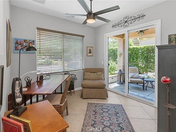 This popular UPDATED SYCAMORE Model is Turn-Key and sports 1,501 sq ft of living space and an open light and bright spacious floorplan. Beautiful leaded glass window rear door opens to a quaint private fully fenced backyard and Alumawood type patio cover with a fan. Custom stained and bordered concrete walkway to home entrance and rear yard. Custom rear planters with watering system. Newer AC unit. Open family room with fireplace, separate office/flex room and Primary bedroom with sliding glass door rear yard access to second integrated patio area. Kitchen has large granite countertop with granite backsplash. Double sinks with stone counters in master bath. Plantation shutters, epoxy garage flooring and so much more! A must see!