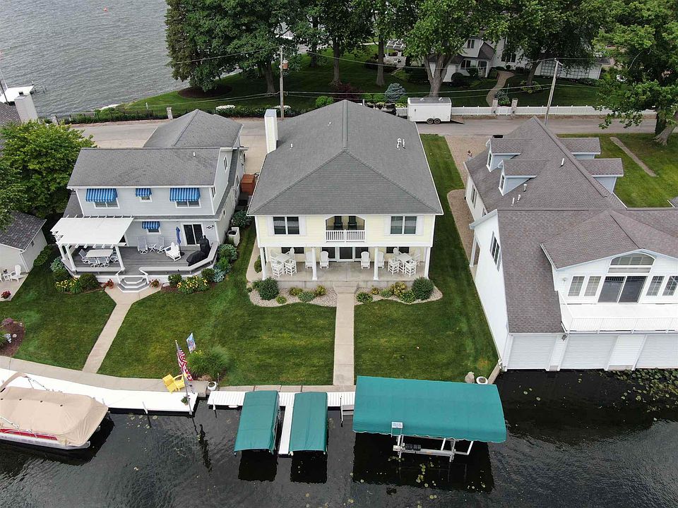 Morrison Island Rd, Wawasee Channel front home just off Lake front . Stunning contemporary home with 4 Bedrooms and 3 1/2 baths. Open kitchen area with water view inviting bar, sitting area (breakfast nook) and dining room. Living room with fireplace .Main level has laundry room and a 1/2 bath. Upper level family room with lake view and balcony. Master suite with walk in closet ,bath and a covered balcony to enjoy the water view. 3 Additional bedrooms and 2 full baths complete the upper level. Dual Furnace and sprinkling system. Over sized 2 car garage with extra storage area . Entertaining patio and porch area to enjoy the views. Boat lift and jet ski lifts are included. Beautiful lake and channel views thru out the home .